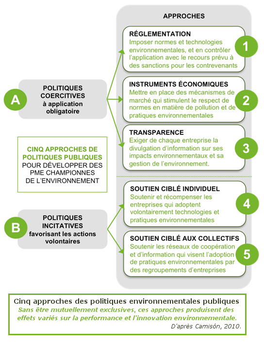 Il ne faut donc pas croire qu’en encadrant peu les entreprises et en les laissant établir leurs propres politiques, il y ait soudainement plus de PME innovantes dans leur gestion de l’environnement. À cet égard, Camisón rappelle la difficulté pour les PME de s’autoréguler sans motivations financières. Il est en effet facile d’ignorer les normes environnementales au profit des finalités économiques, d’où l’intérêt de programmes récompensant les efforts en cette matière, que ce soient en procurant des avantages fiscaux, financiers ou commerciaux aux entreprises les plus motivées.