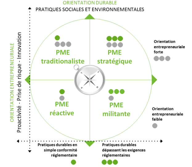 La Boussole de la durabilité pour les PME, c’est en fait une matrice qui permet un positionnement selon l’axe de l’orientation durable et l’axe de l’orientation entrepreneuriale. L’orientation durable évalue les pratiques environnementales, sociales et communautaires. L’orientation entrepreneuriale mesure l’attitude envers trois comportements fondamentaux de l’entrepreneuriat.