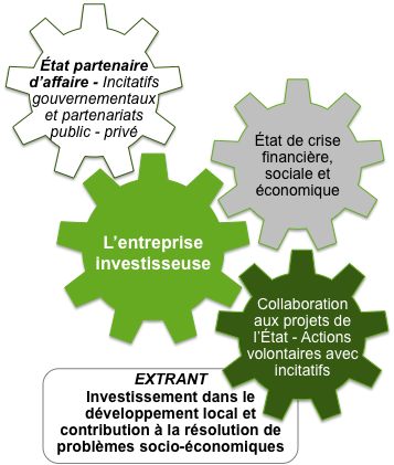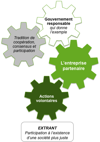 Avec l’approche citoyenne, chaque composante de la société est appelée à faire sa part, les entreprises comme les autres. Les gouvernements privilégient la promotion de la RSE et la sensibilisation des entreprises à leur rôle citoyen tout en ayant parfois recours à la réglementation. Les corporations participent à la vie en société de façon constructive, en privilégiant la transparence et le respect de leurs obligations légales, certes, mais aussi en formant des alliances avec tous les acteurs de la société.